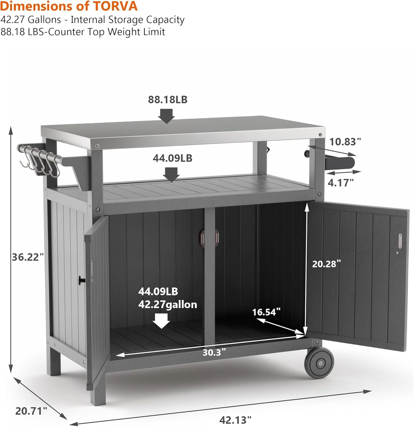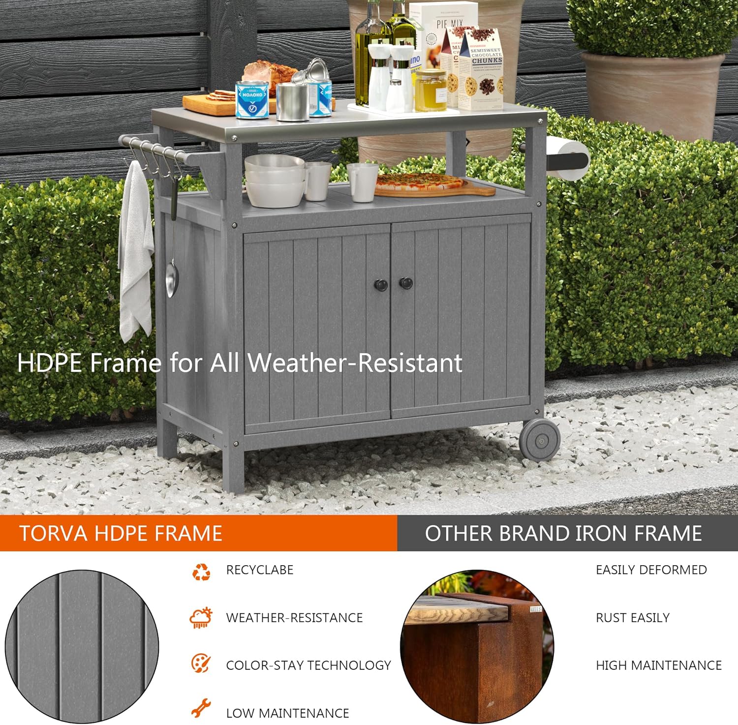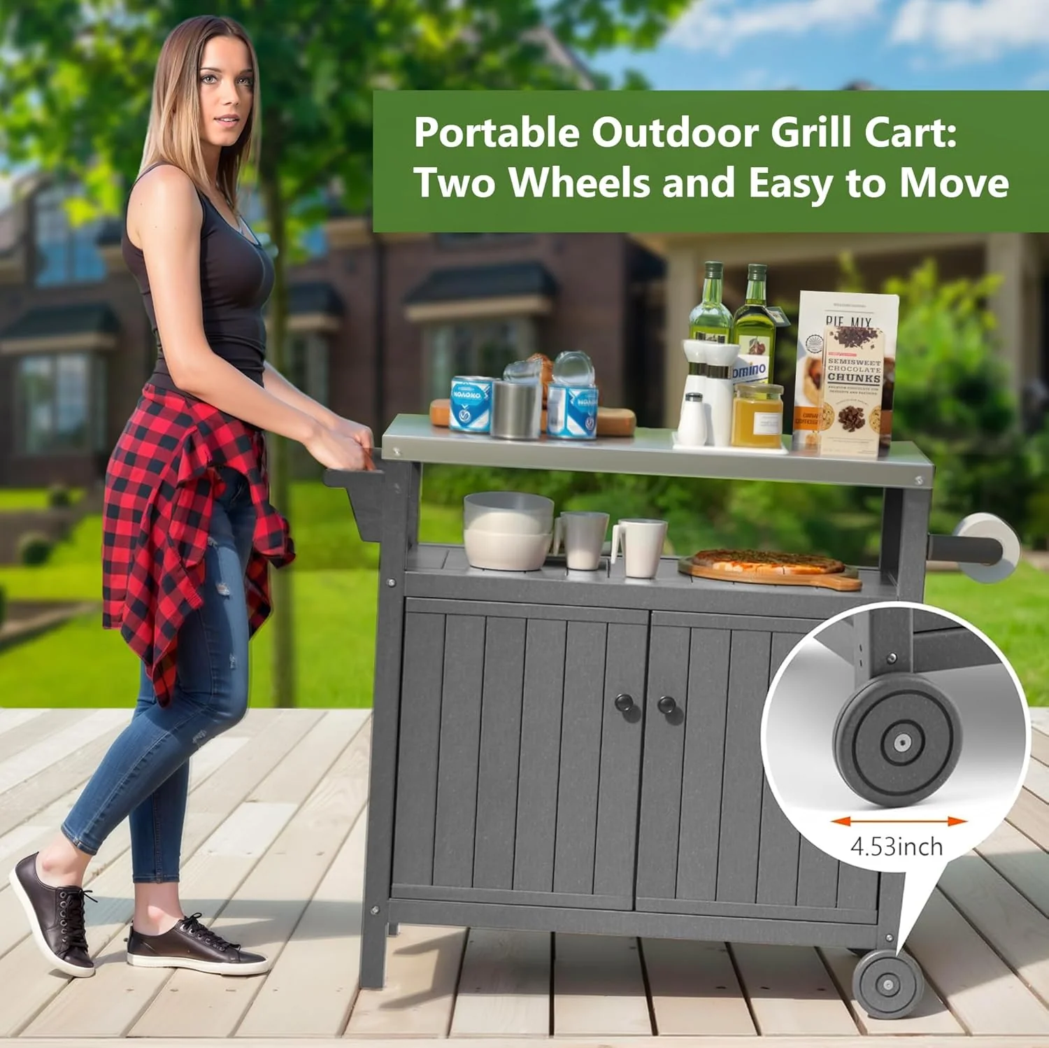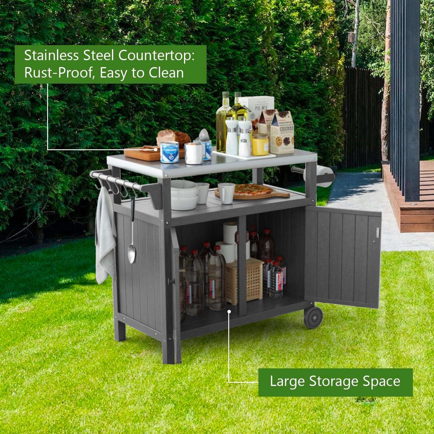 "Portable Outdoor Grill Prep Table with Storage, Stainless-Steel Tabletop, BBQ Cart with Wheels and Side Shelf | Gray"